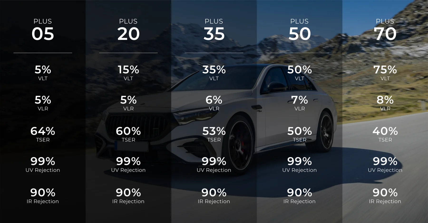 SHADE PLUS is our signature hybrid nano-ceramic window film engineered to offer outstanding value without compromising on performance. Designed for drivers who prioritize both protection and affordability, SHADE PLUS effectively blocks up to 99% of harmful UV rays, helping to preserve your car's interior and safeguard passengers from long-term sun exposure.
