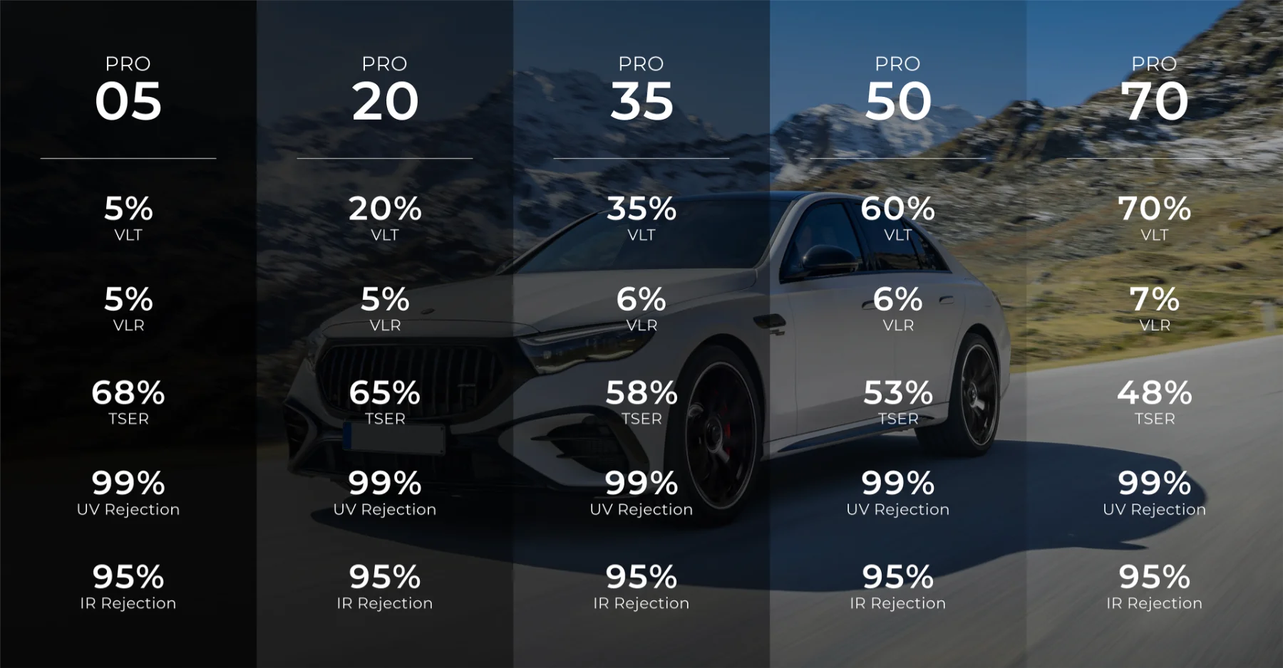 The PRO Series is engineered using advanced nano-ceramic technology, offering superior protection against harmful UV rays and solar heat. This high performance tint not only helps reduce the interior temperature of your vehicle, keeping it cooler and more comfortable during hot days, but also contributes to better energy efficiency by reducing the need for excessive air conditioning.